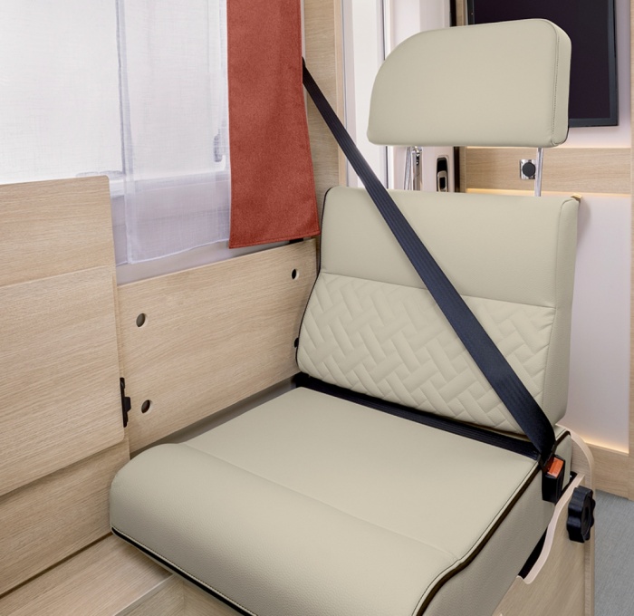 Välj inredningen som matchar din stil, LUCEO eller NACARAT, och din standardklädsel, PALMA eller NOUMEA*. Modellerna 666F och 696F i Specialserien 65 år har en klädsel med ett «65 år»-broderi (PALMA och NOUMEA).